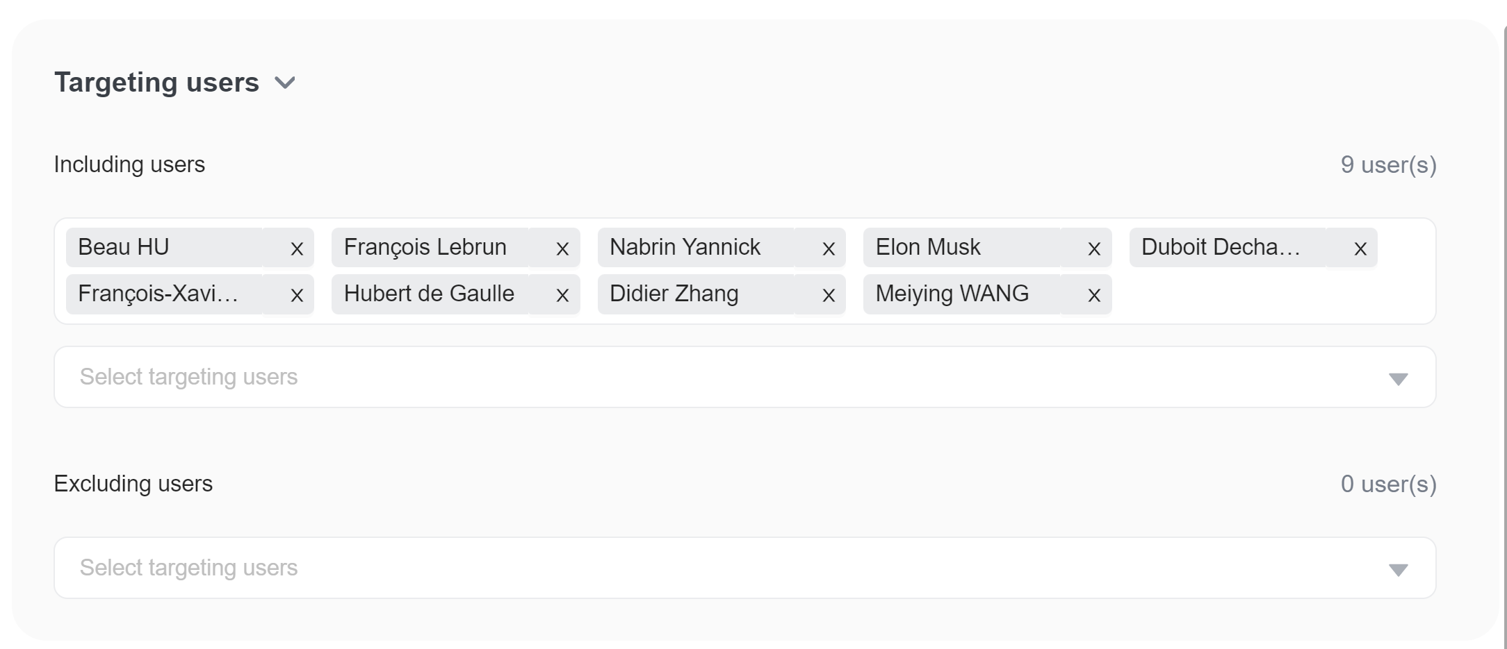 - Individually target users with the Including users or Excluding users options.