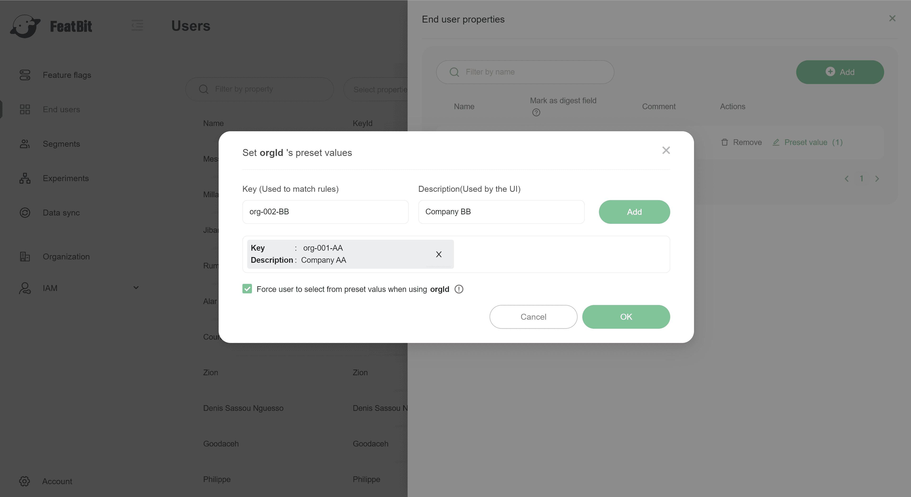 Be sure that the property "orgId" and the value have been passed to FeatBit system when initializing SDK. Be sure that the key you set in preset values (image above) is as same as what you passed in the code of SDK initiliazing.